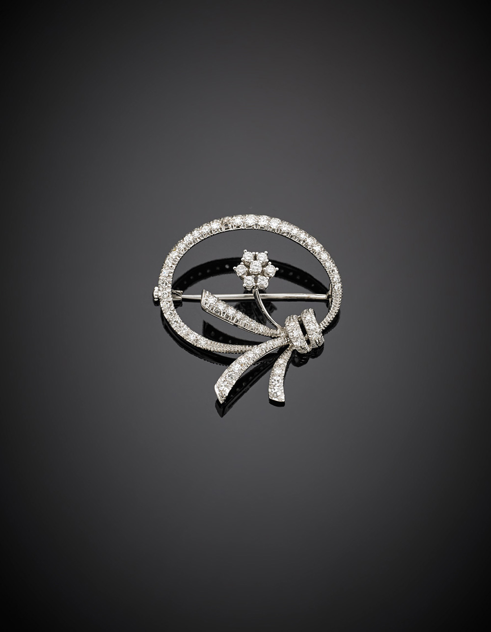 White gold round diamond brooch, g 8.82, length cm 3.50 circa (losses).