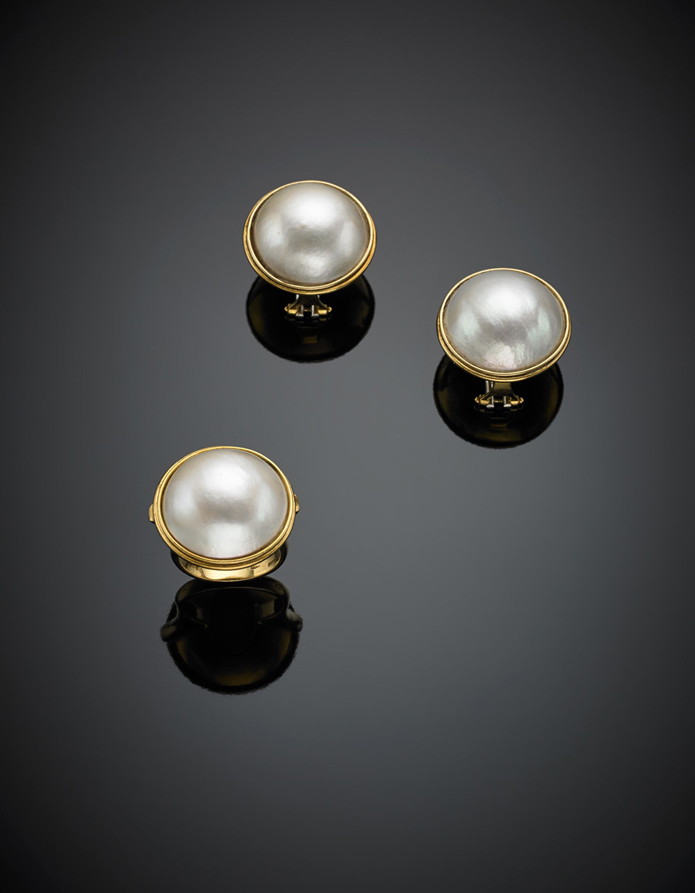 Yellow gold and mabè pearl d. mm 20 ca. demi-parure comprising a pair of earrings and a ring g 34.66 size 10/50.