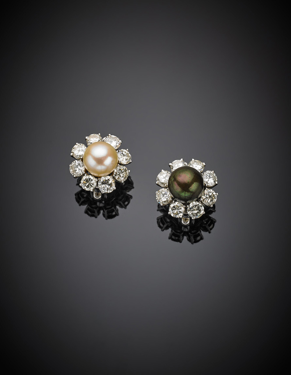 Orecchini a lobo con clip in oro bianco, una perla bianca e una nera contornate da otto diamanti per complessivi ct.5,60 circa, g 11,93.