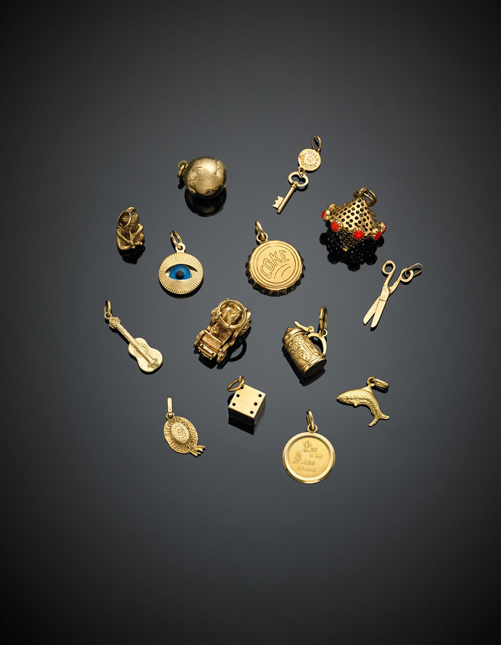 Gruppo di quattordici charms in oro giallo g 44,20.Lot of fourteen yellow...