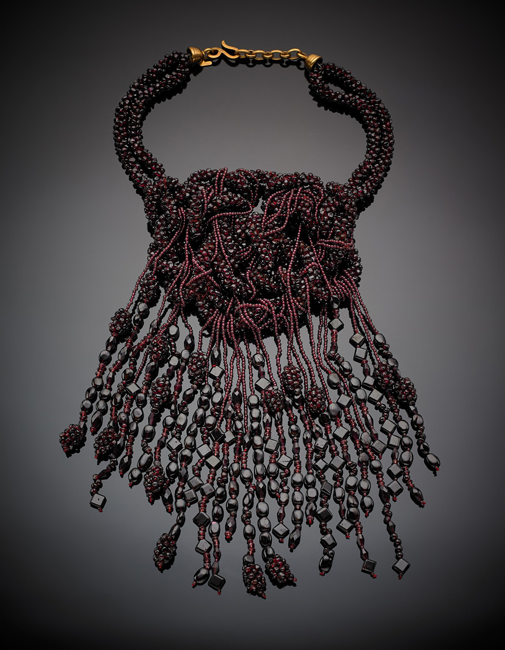 Grande collana intrecciata con frangia di pendenti di granati lisci e...