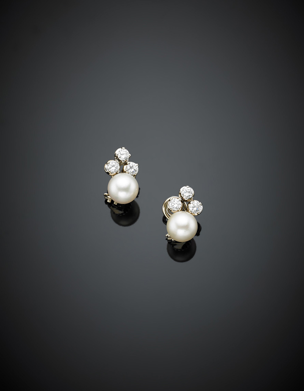 White gold diamond, in all ct. 1.20 circa earrings with two white cultured pearls of mm 10-10.50, g 10.10.