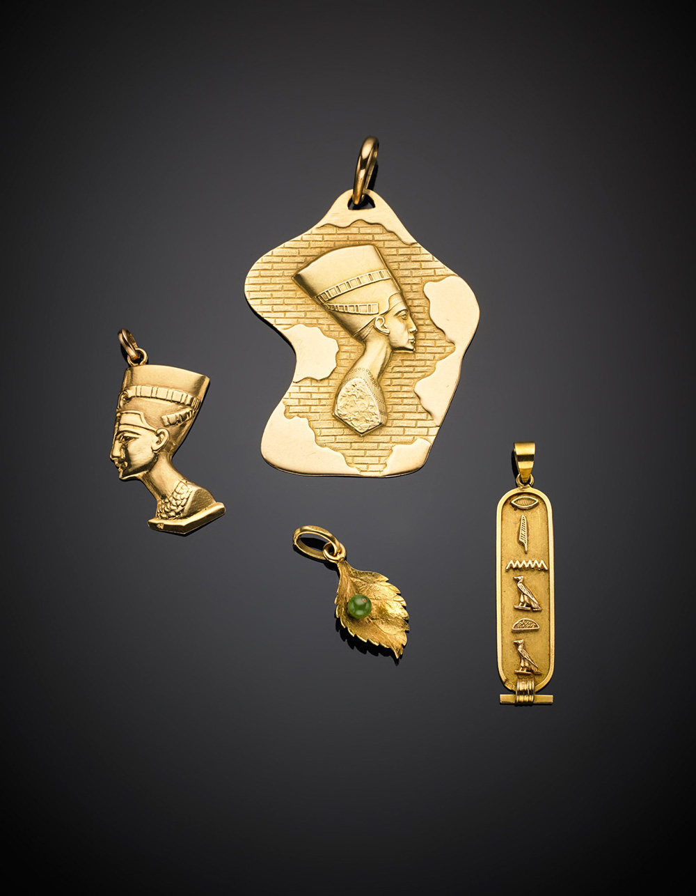 Lotto 1911 | Lotto di tre pendenti in oro giallo a soggetto egizio e piccolo pendente a...