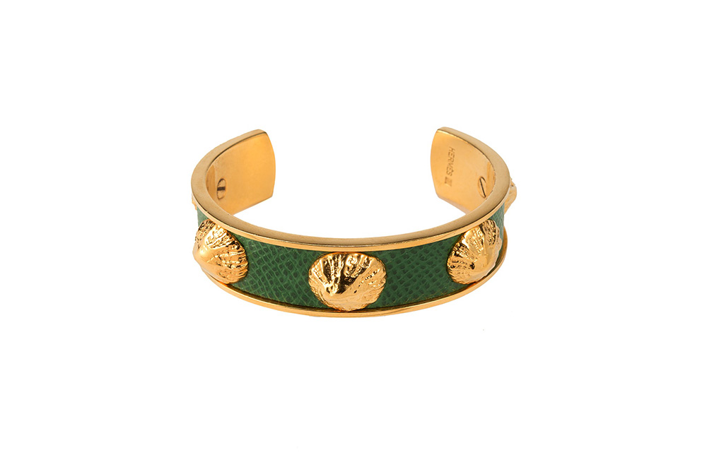 Bracciale rigido alla schiava color oro e pelle martellata verde con applicate conchigliette in metallo color oro, con sacchetto
