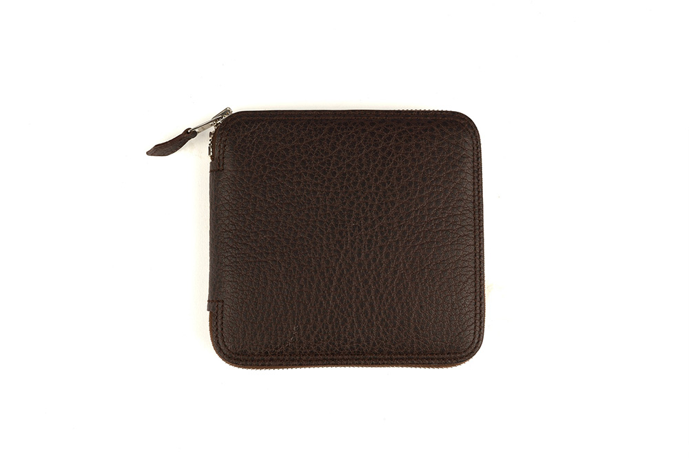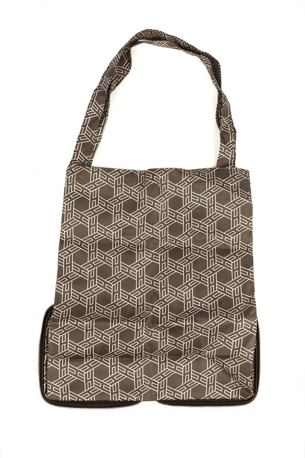 Astuccio in pelle martellata color marron glacè che aperto si traforma in borsa shopper logata (dimesioni esterne cm 13x13x2)