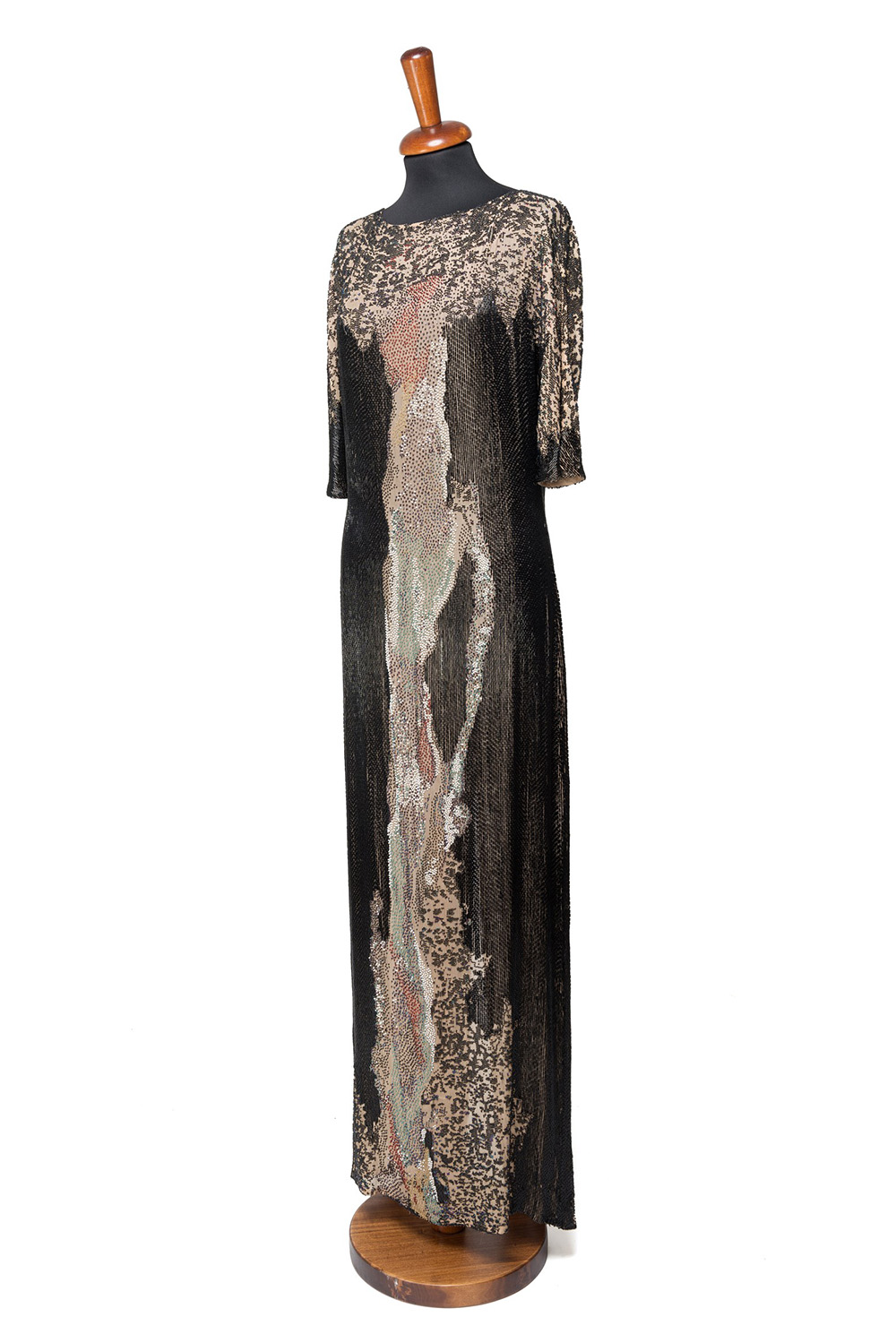 Long evening dress embroidered with black, turquoise and multicoloured bugle beads and sequins, slit on the back (size 42)