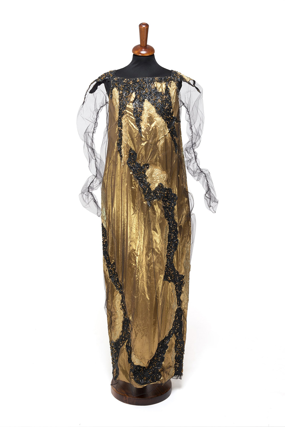 Particular evening dress in gold lamè and and black tulle with rubber inserts (size 44)