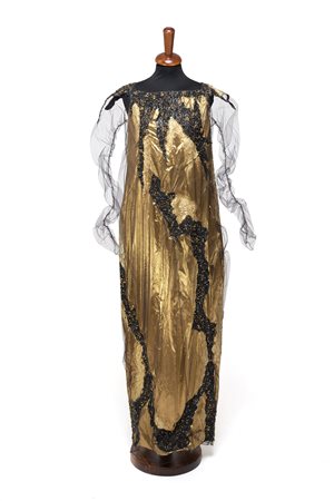 KRIZIAAbito scultura da sera lungo in lamè oro e tulle nero con ricami e...