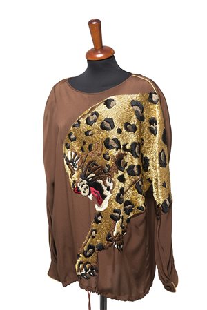 Casacca con arricciatura alla base, di colore marrone con ricami oro, avorio, rosso, nero e bronzo a disegnare il suo classico leopardo (tg 42)
