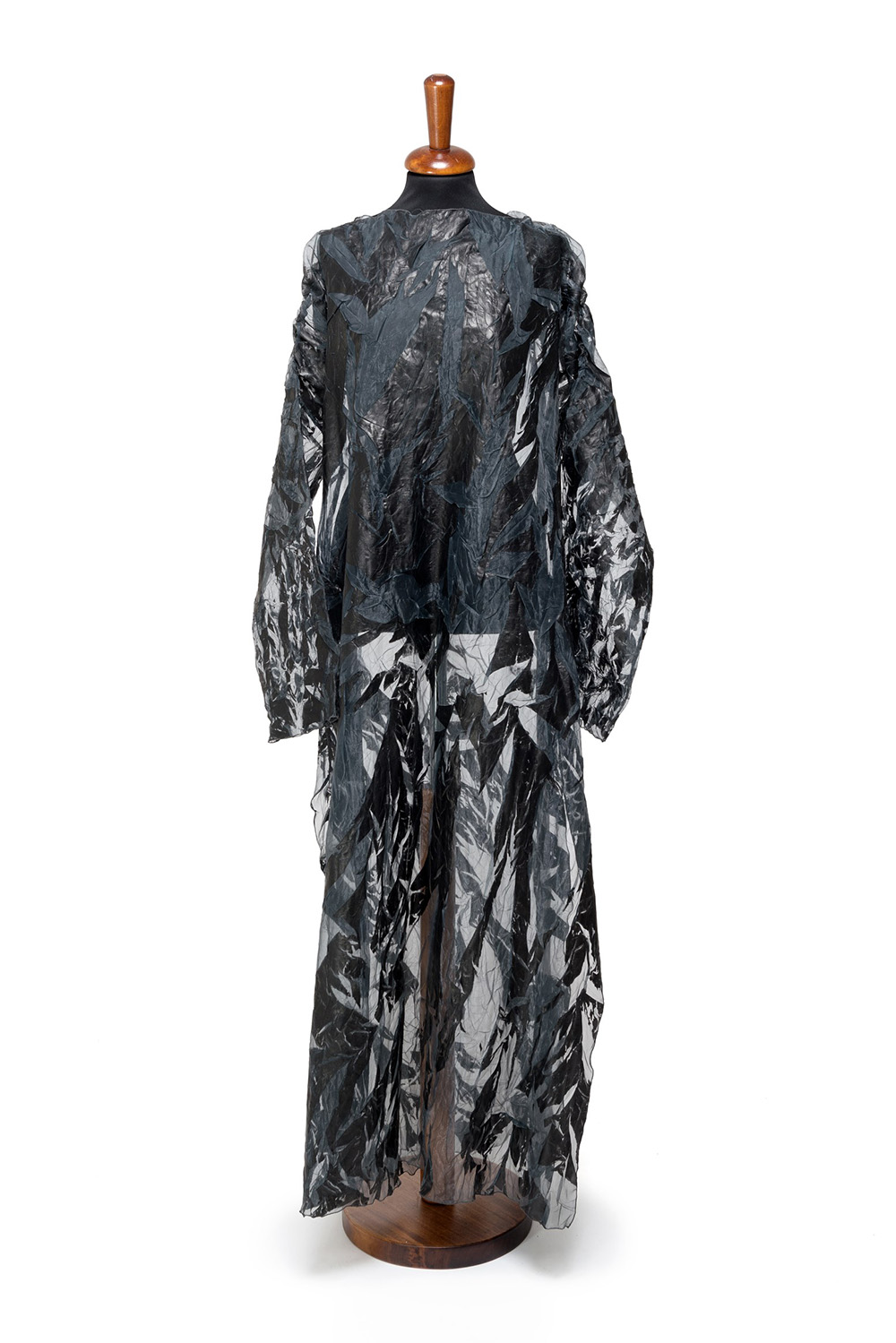 CAPO CAMPIONEAbito lungo in garza color blu petrolio e intarsi come foglie in...