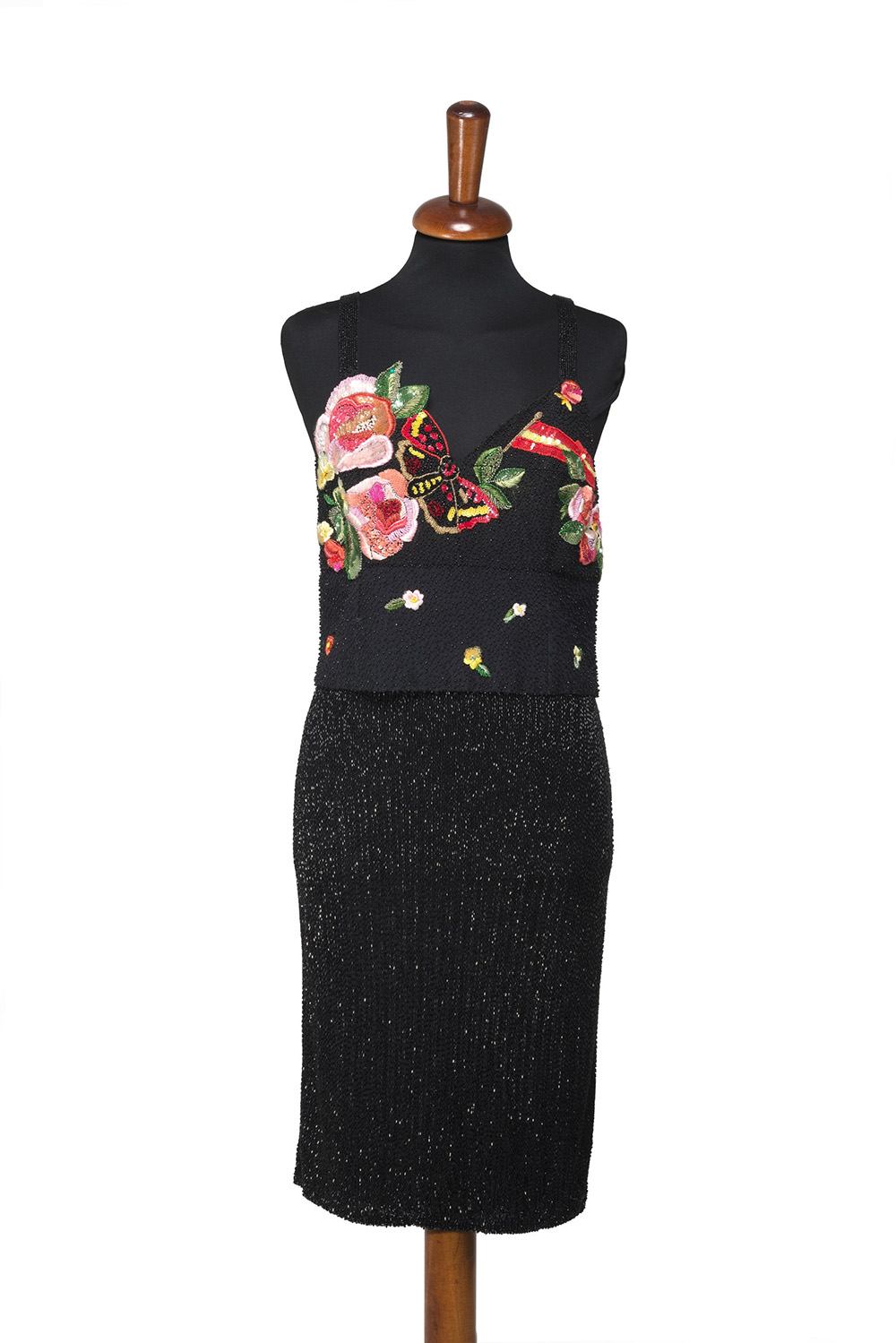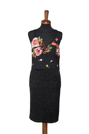 Lotto composto da una gonna e un top entrambi a base nera. La gonna con ricamo a canottiglie e il top con ricamo a boules nere e intarsi con pailletes multicolor di fiori e farfalle (tg 42)