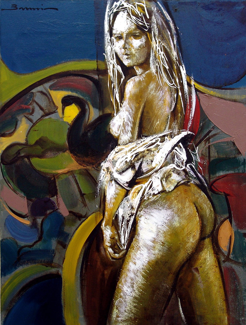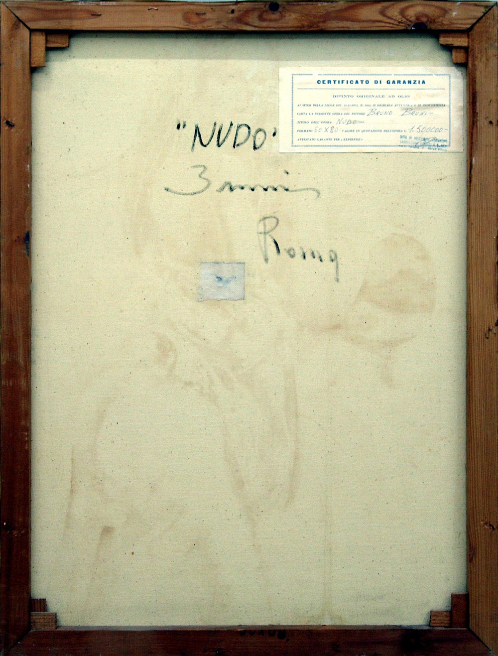 Bruno Bruni 1935, Gradara (Pu) - [Italia] Nudo olio su tela 80x60 cm c. 1970 firma dell’artista in alto a sinistra e sul retro; opera con cornice certificato di autenticità di Melchionne Costantino di Roma