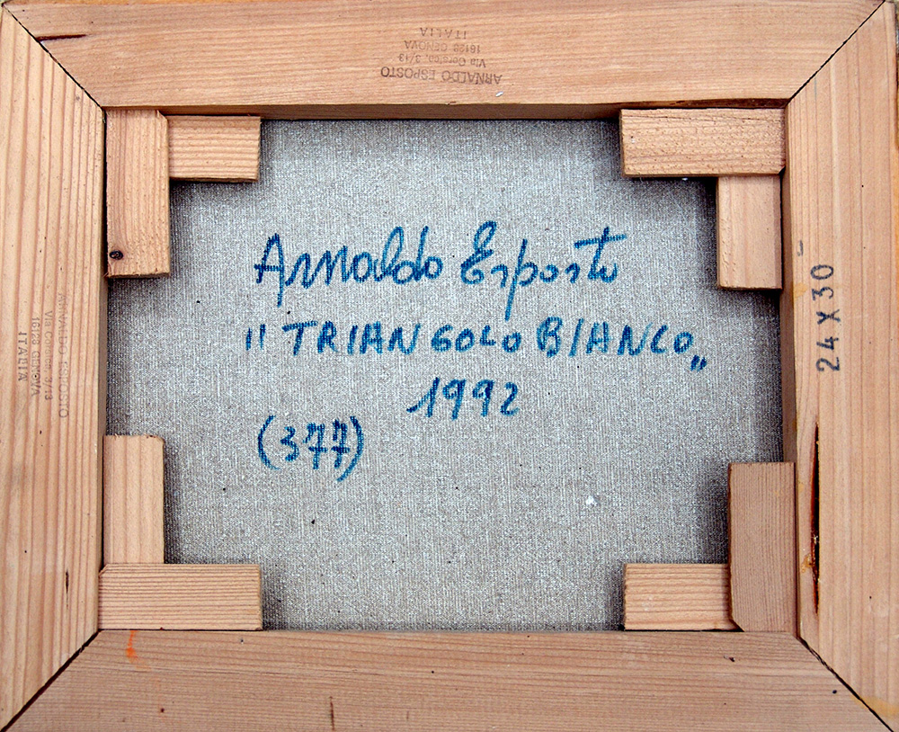 Arnaldo Esposto 1933, Genova (Ge) - 1996, Genova (Ge) - [Italia] Triangolo bianco tecnica mista su tela 24x30 cm 1992 firma dell’artista in basso a destra e sul retro; opera con cornice certificato di autenticità Picenum