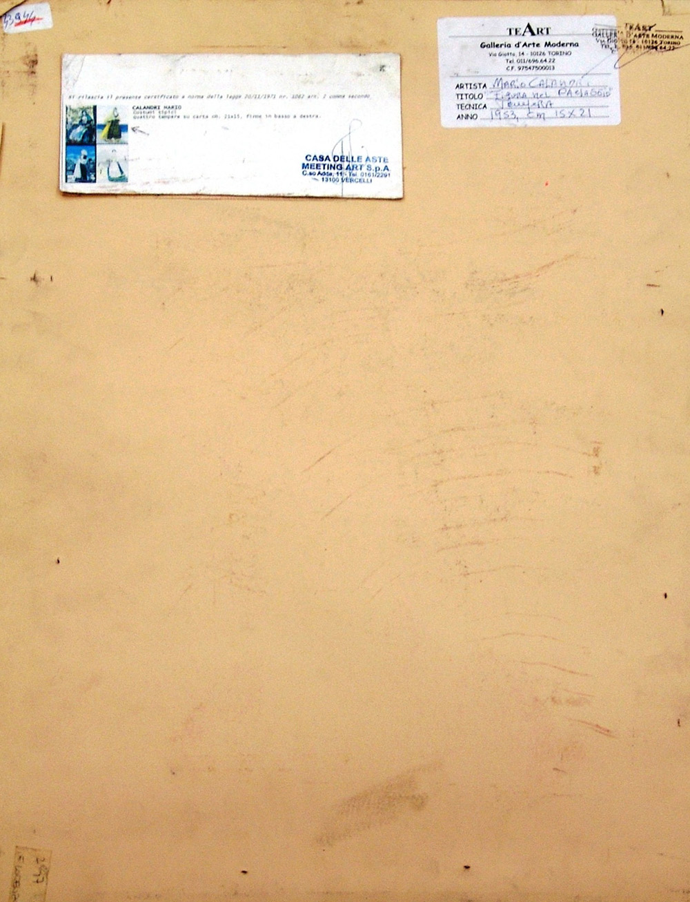Mario Calandri 1914, Torino (To) - 1993, Torino (To) - [Italia] Figura nel paesaggio tempera su carta 21x15 cm 1953 firma dell'artista in basso a destra; opera con cornice certificato di autenticità della Meeting Art di Vercelli; certificato di autenticità della Galleria d'Arte Moderna TeArt di Torino