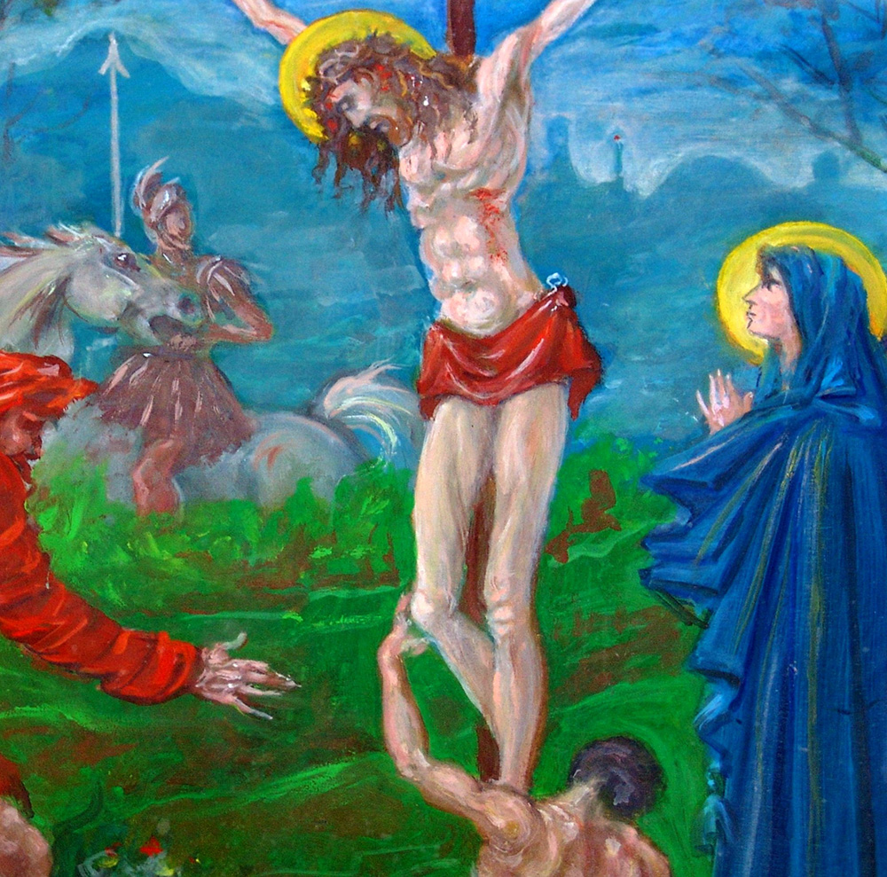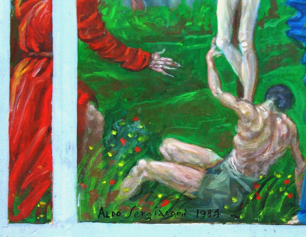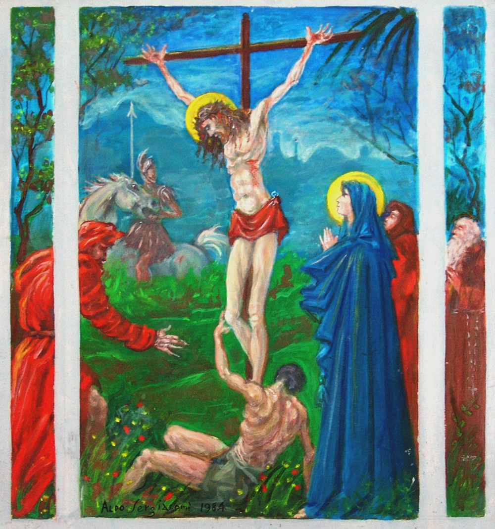 Aldo Sergiacomi 1912, Offida (Ap) - 1994, Offida (Ap) - [Italia] Crocifissione olio su tela 70x65 cm 1984 firma dell’artista in basso a sinistra; opera con cornice certificato di autenticità Picenum