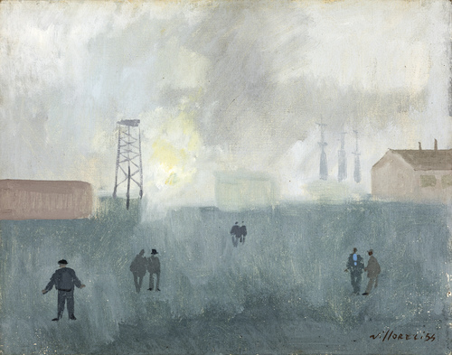 Franco Villoresi, OPERAI CHE VANNO A LAVORO Olio su tela, cm 35x45Firmato in basso a destra Villoresi '54Etichetta al retro Galleria "La Fontanella"Autentica su fotoOpera sprovvista di cornice