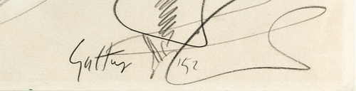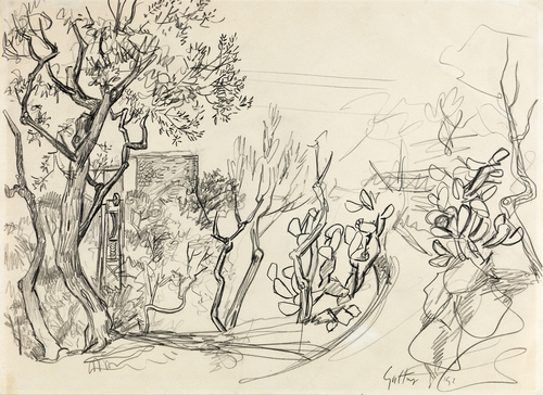 Renato Guttuso, PAESAGGIO MERIDIONALE Disegno a matita su carta, cm 62x45Firma e data in basso a destra "Guttuso '52"Al retro cartiglio della galleria "La Nuova Pesa", Roma