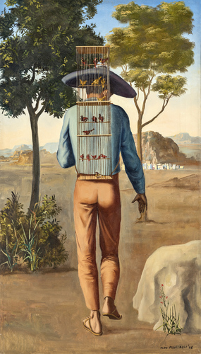 Aldo Pagliacci, VENDITORE DI UCCELLI Olio su tela, cm 70x40Firma e data in basso a destra "Aldo Pagliacci '68"