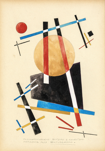 Anonimo, FIGURA ASTRATTA Tecnica mista su carta, cm 32,5x23In basso dedica in russo "Le figue Geometriche in occasione, In regalo per Shklovsky"