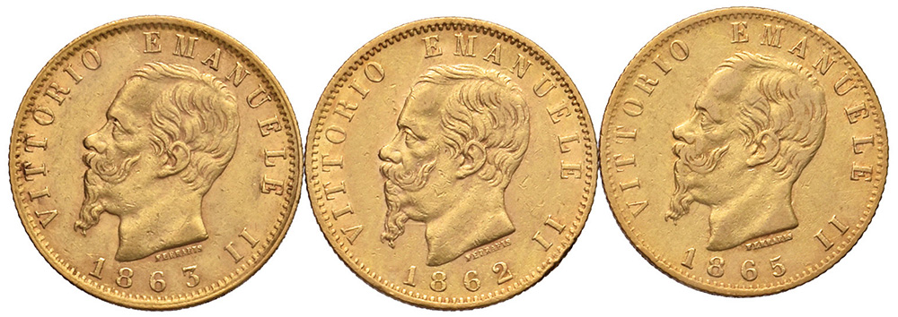 20 lire 1862, 1863, 1865 Torino. Oro. BB o migliori.