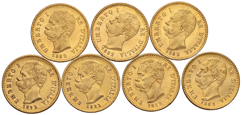 20 lire 1882. Oro. Lotto di 7 esemplari. BB/SPL o migliori.