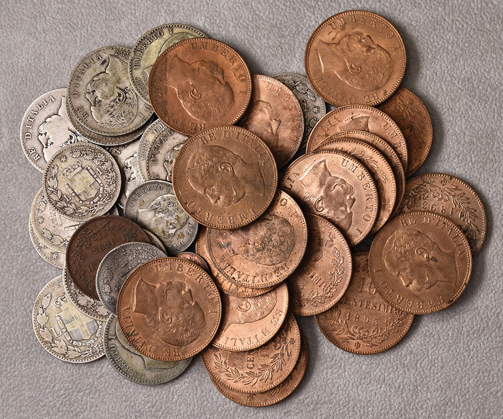 43 monete in argento e rame: 11 da 2 lire; 8 da una lira; 19 da 10 centesimi; una da 5 centesimi; una da 2 centesimi; 3 da un centesimo.