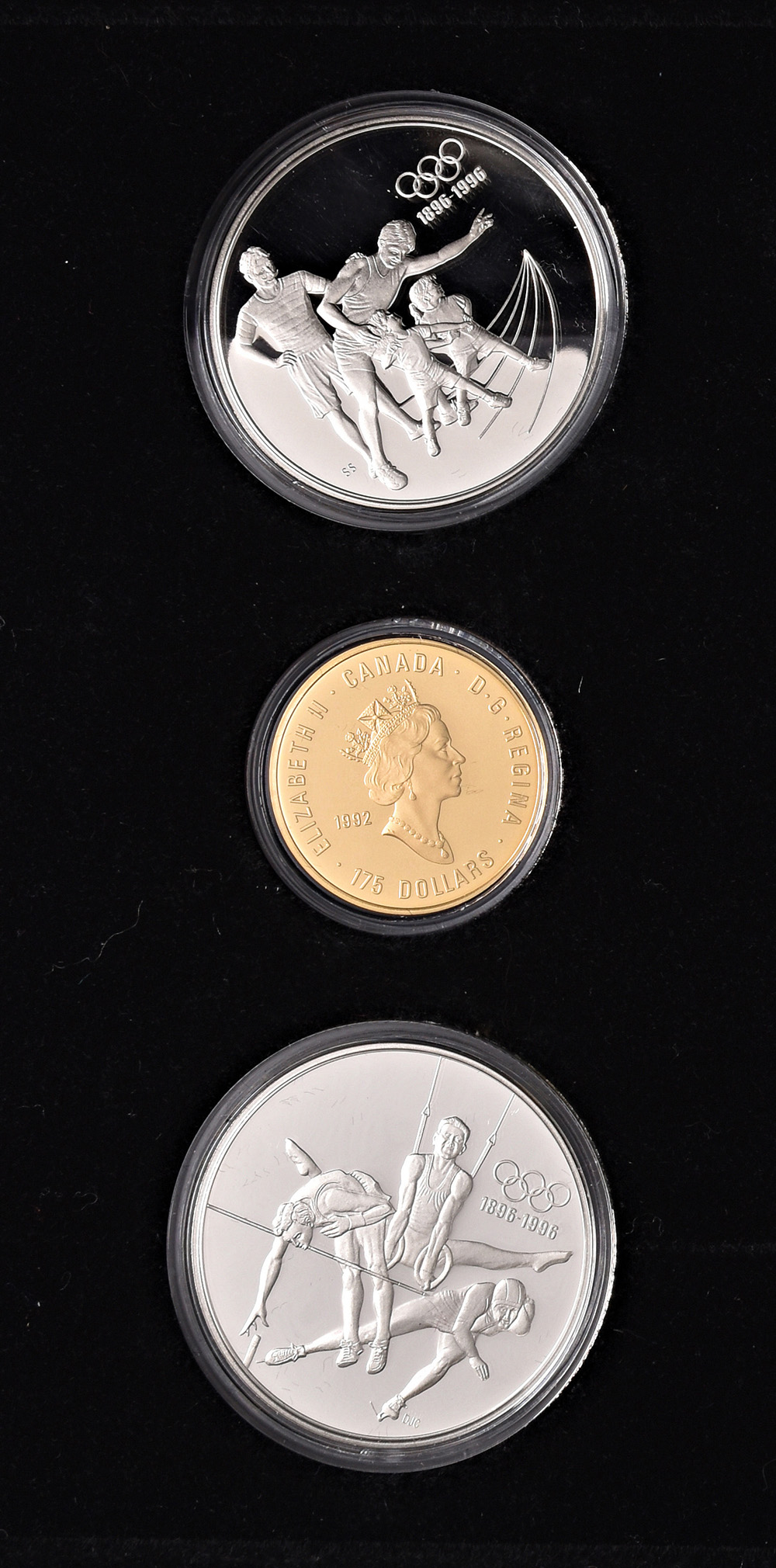 1992 astuccio contenente tre monete 1992: una in oro da 175 dollari e due in argento da 15 dollari per il centenario dei Giochi Olimpici, 1886-1996.
