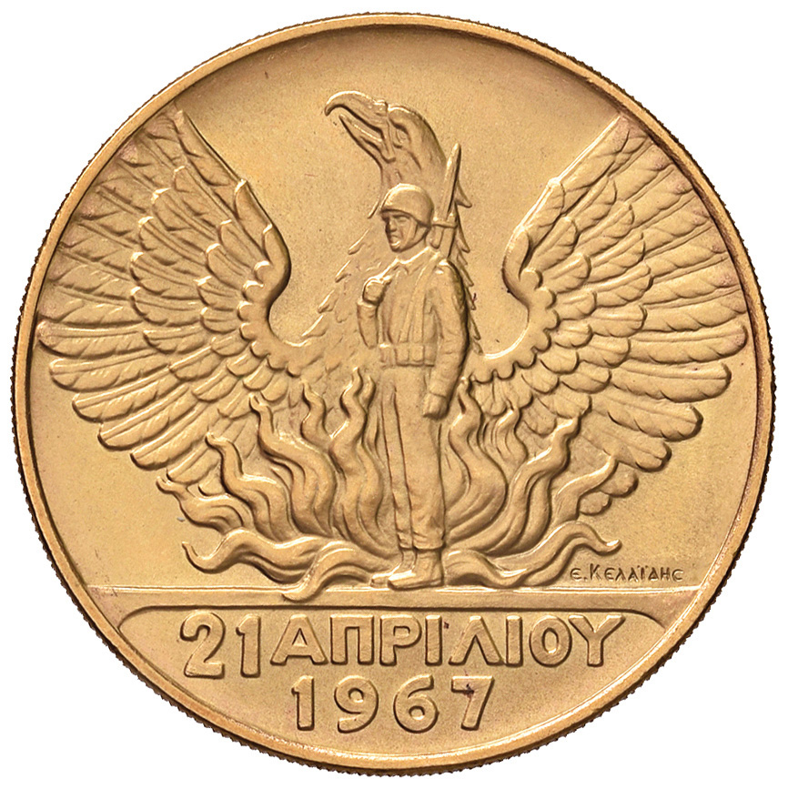 100 dracme coniate nel 1970 per la rivoluzione del 1967, in oro. FDC.
