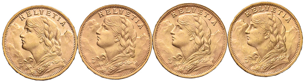 SVIZZERA. Confederazione.20 franchi 1935 L-B (3) e 1947/B. Lotto di 4 monete...