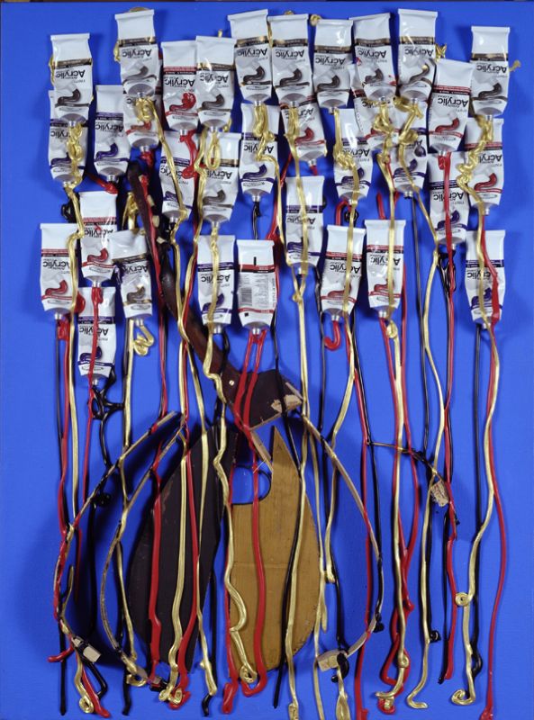 Fernandez Arman (Nizza, 1928 - New York, 2005) Senza titolo Assemblaggio di mandolino e tubi di colore su tela dipinta ad acrilico riportata su tavola, cm. 81,5x60,5x9 Firma sul bordo esterno inferiore. Sul verso: etichetta Arman Studio, New York. Autentica su foto Archives Denyse Durand-Ruel, n. arch. 7010, recante firma dell’autore.