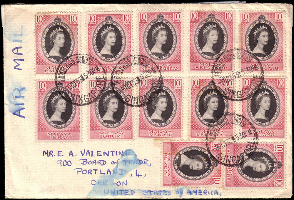 Busta da Singapore per Portland (Stati Uniti), affrancata con il giro completo degli 11 stati più Singapore, della serie "Coronation".