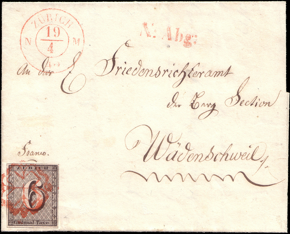 Letter with text from Zurich to Wädenswil, franked with 6Rp. black with red background vertical lines.