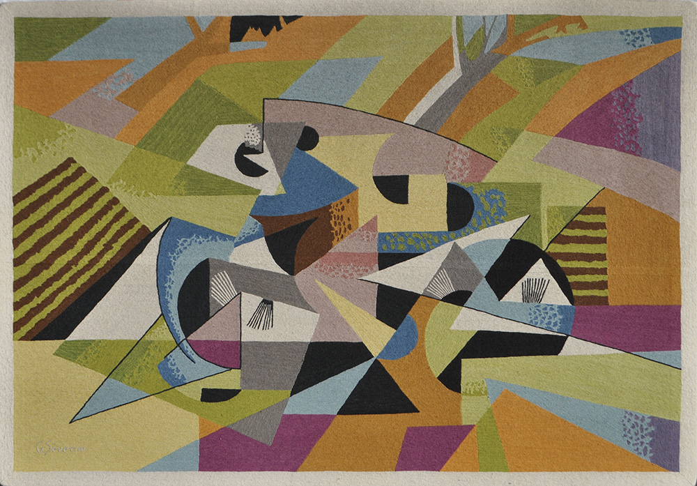 Gino Severini (Cortona 1883 - Paris/Parigi 1966) Il ciclista nella campagna, 1977;Arazzo tessuto a mano, 150 x 210 cm, da un disegno di Gino Severini