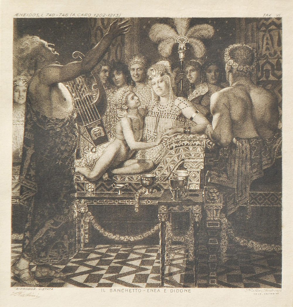 Luigi Ratini 5 acqueforti tratte dall'Eneide, 1925;Giunone ed Eolo; Enea si presenta a Didone; La tempesta- l'ira di Nettuno; Giove e Venere; il banchetto - Enea e Didone, cadauna ca. 16,5 x 16 cm (lastra), 234 x 27 (foglio), Calcografia Cavadini
