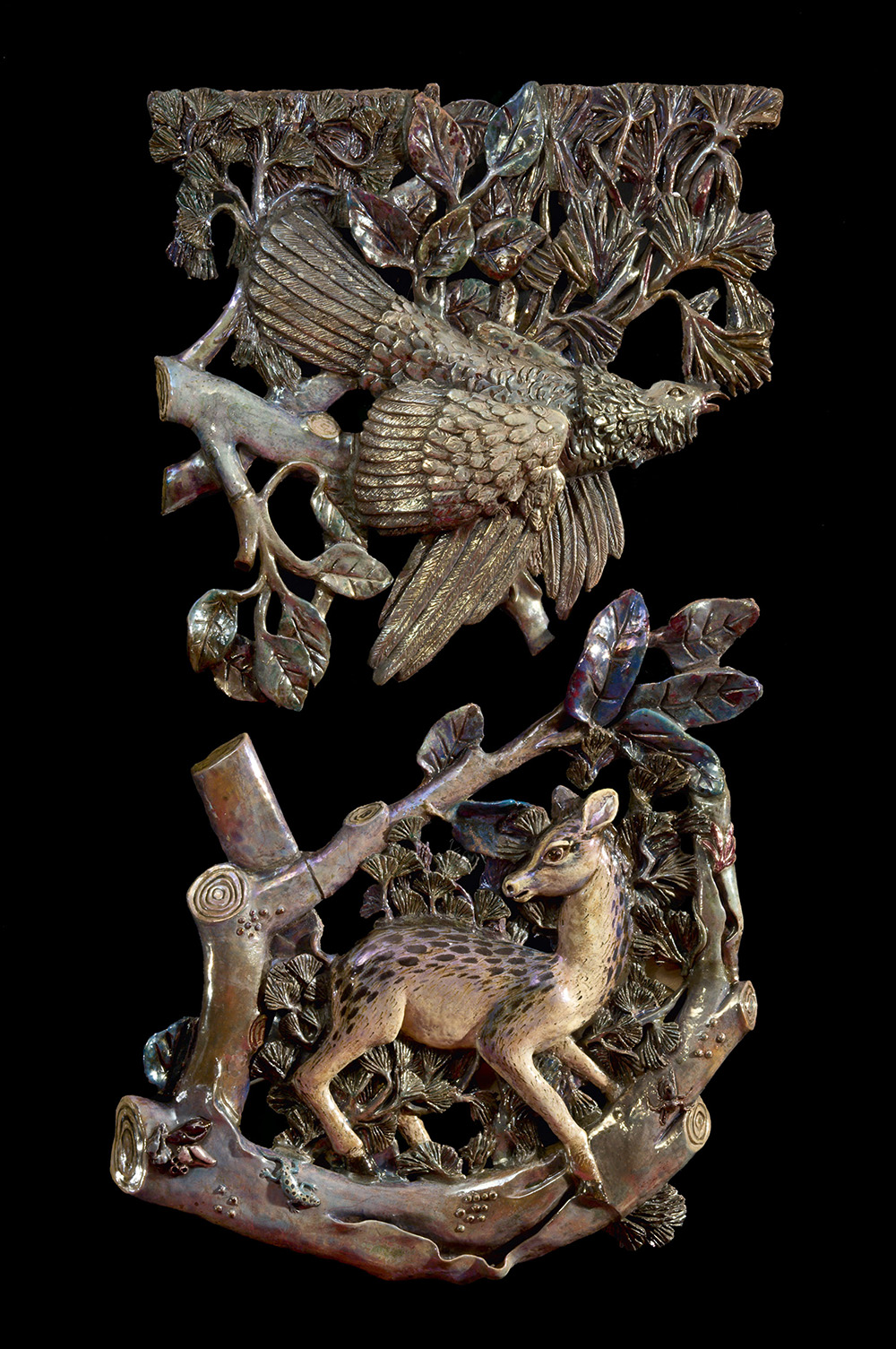 Maiolica lustro, Composizione in due parti staccate tra loro, di scena raffigurante cerbiatto e gallo cedrone, 69 x 59 cm, 64,5 x 64 cm, restauri