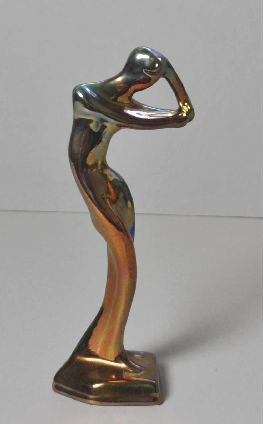 Riccardo Gatti (Faenza 1886 - Venedig/Venezia 1972) Figura femminile, 1930-35;Maiolica policroma a lustro metallico, h. 26 cm, ossidazioni, marchio alla base