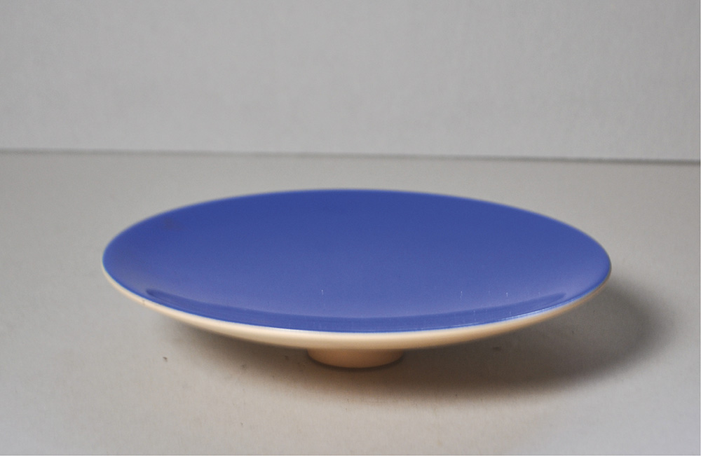 Legno laccato blu e albicocca, h 5,5 cm, diam. 24,5 cm, produzione Zanotta-Zabro, collezione Nuova alchimia