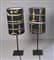 Piero Fornasetti (Mailand/Milano 1913 - 1988) Paar Tischlampen Modell "I bastioni";Metall, Lampenschirm schwarzer Karton mit Siebdruckmuster, Höhe 61 cm, Produktion Fornasetti Milano