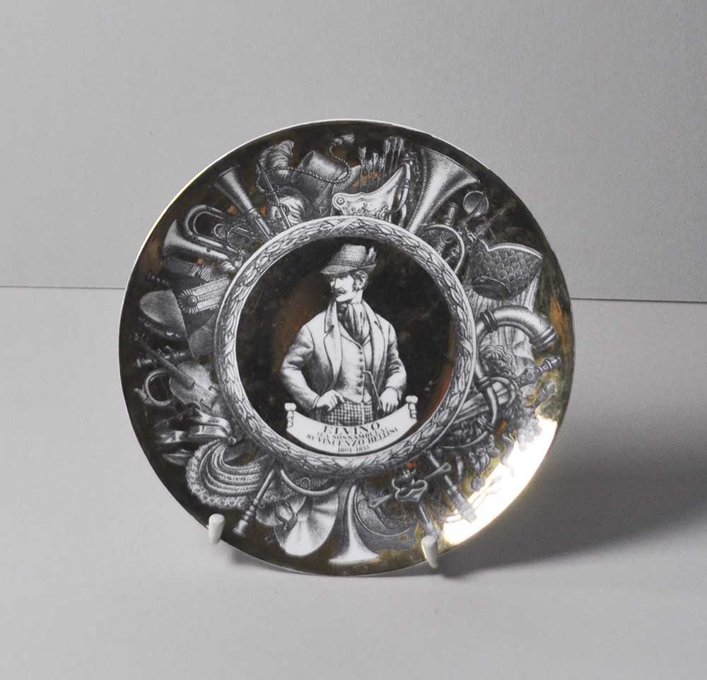Ceramica serigrafata, diam. 25,7 cm, Serie Melodramma (Vincenzo Bellini), produzione Fornasetti Milano, marchio alla base