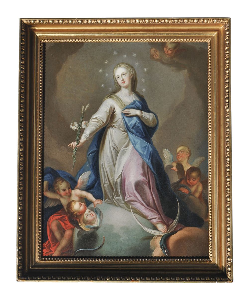Maria Anna Moser (Schwaz 1758 – 1838) Mondsichelmadonna, 1785;Öl auf Leinwand, 71,5 x 55 cm, doubliert, Ochsenaugenrahmen