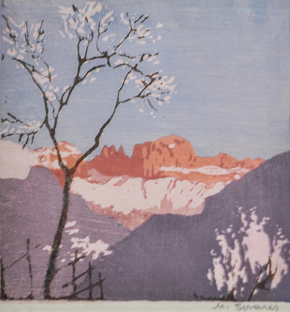 Max Sparer Baumblüte vor Rosengarten;Farbholzschnitt, 23 x 21,5 cm