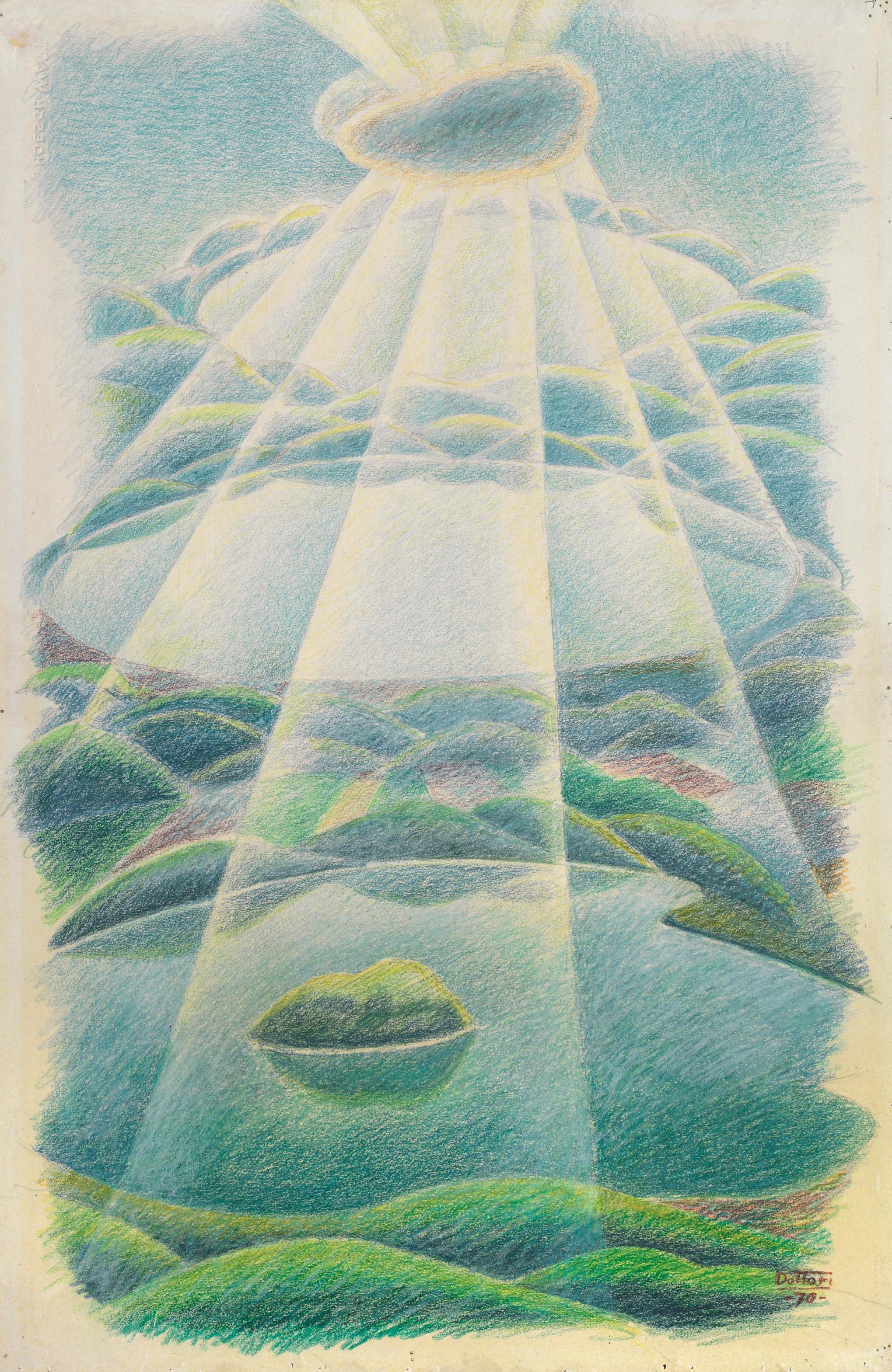 Gerardo Dottori (Perugia 1884 - 1977) IL CANTO DEI LAGHI idromatita su carta, cm 50x32 firmato e datato sul retro: firmato e datato eseguito nel 1970 L'opera è accompagnata da autenticità su fotografia Esposizioni Galleria Borgonuovo, Milano, 1971, cat. n. 55 Provenienza Galleria Borgonuovo, Milano