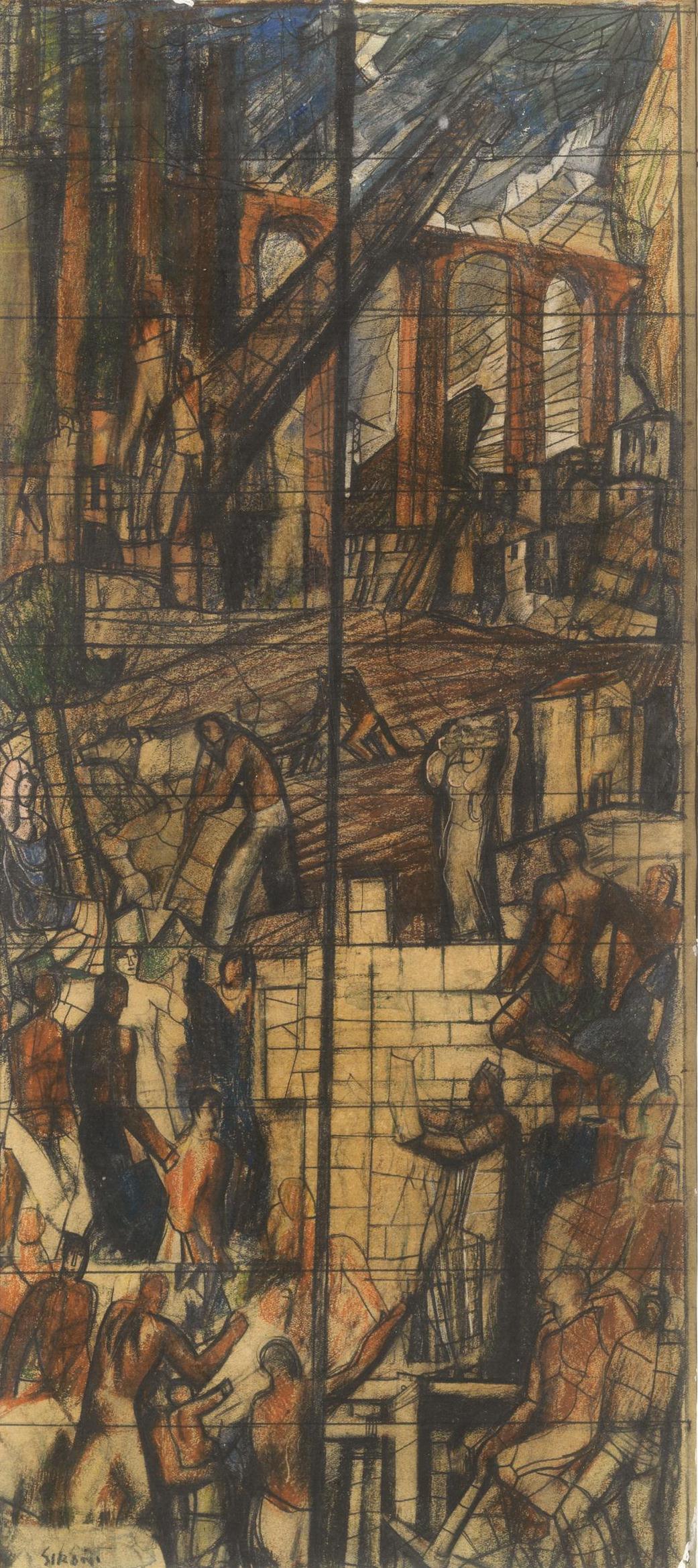 Mario Sironi (Sassari 1885 - Milano 1961) BOZZETTO PER LE VETRATE DEL MINISTERO DELLE CORPORAZIONI DI ROMA matita e pastello su carta applicata su tela, cm 47,5X21,5 firmato eseguito nel 1931
