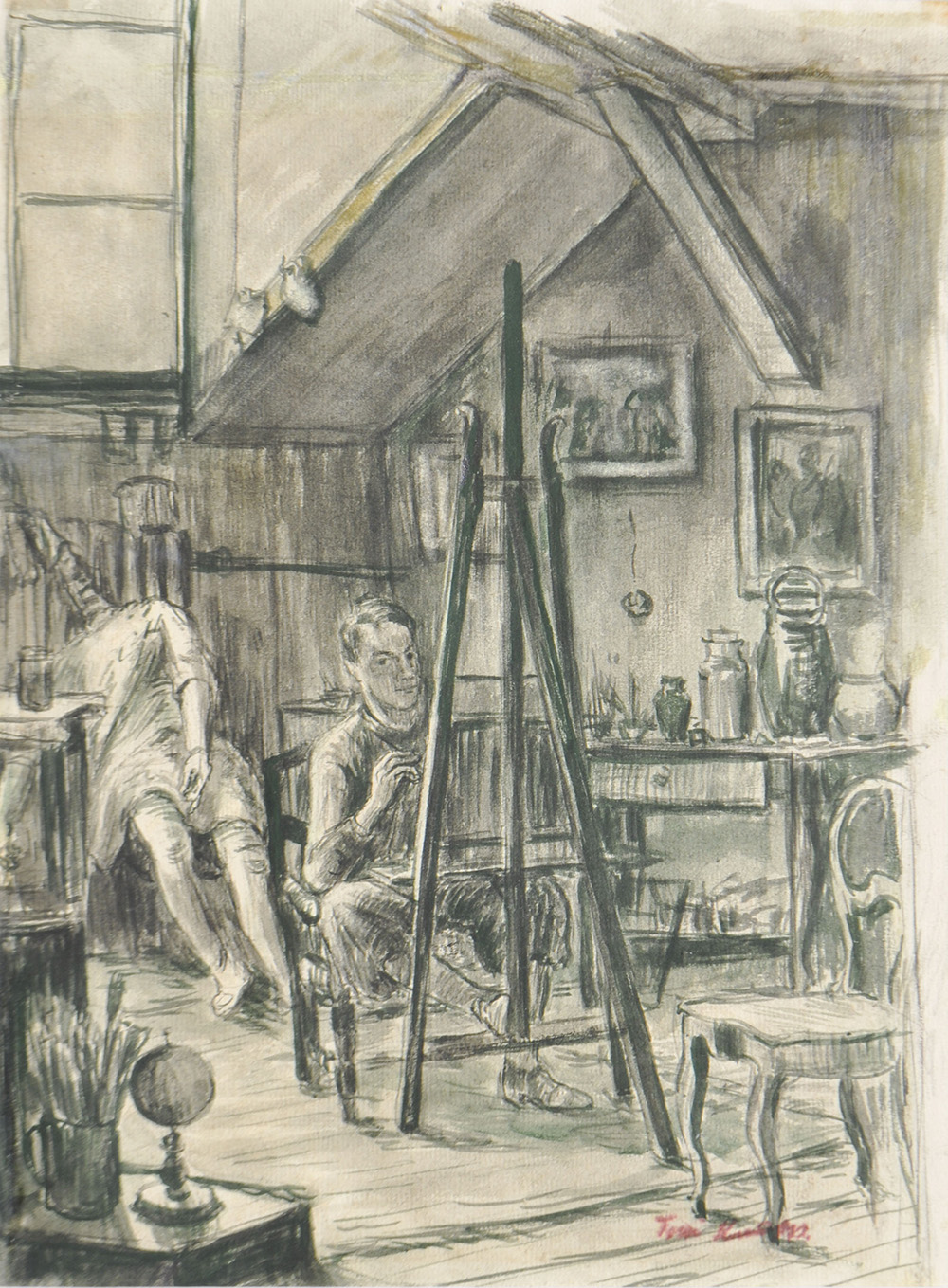 Anton (Toni) Kirchmayr (Schwaz 1887 – Innsbruck 1965) Selbstbildnis im Atelier;Aquarell, 29,7 x 22,2 cm, gerahmt
