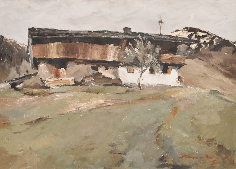 Wilhelm Nicolaus Prachensky ( Innsbruck 1898 – 1956) Tiroler Bauernhof, 1951;Tempera auf Papier, 60,5 x 84,3 cm, gerahmt