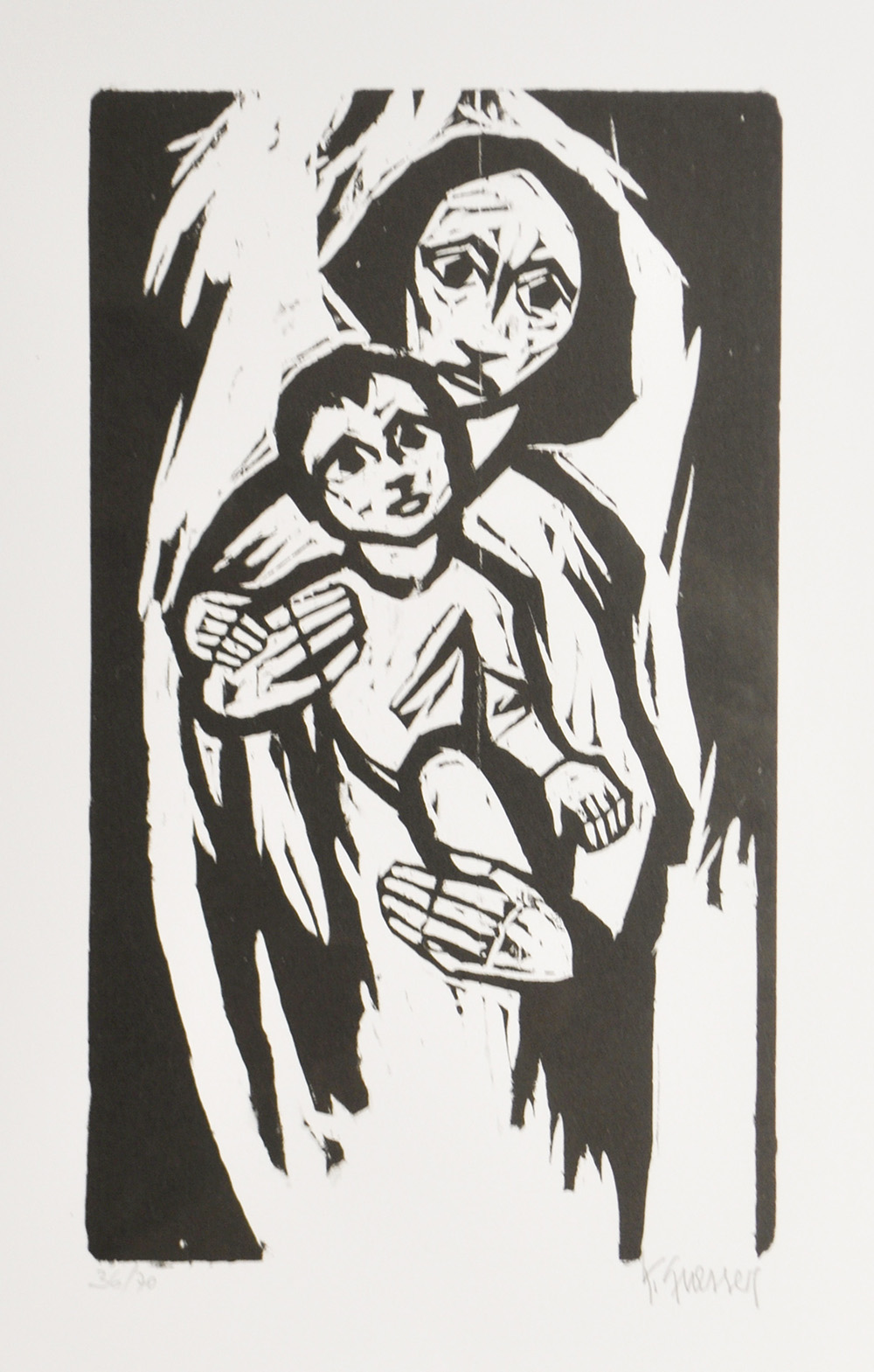 Karl Grasser (*Kortsch/Corces 1924) Mutter mit Kind;Holzschnitt, 39,8 x 20 cm (Blattgröße),