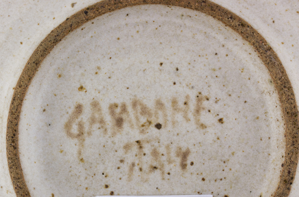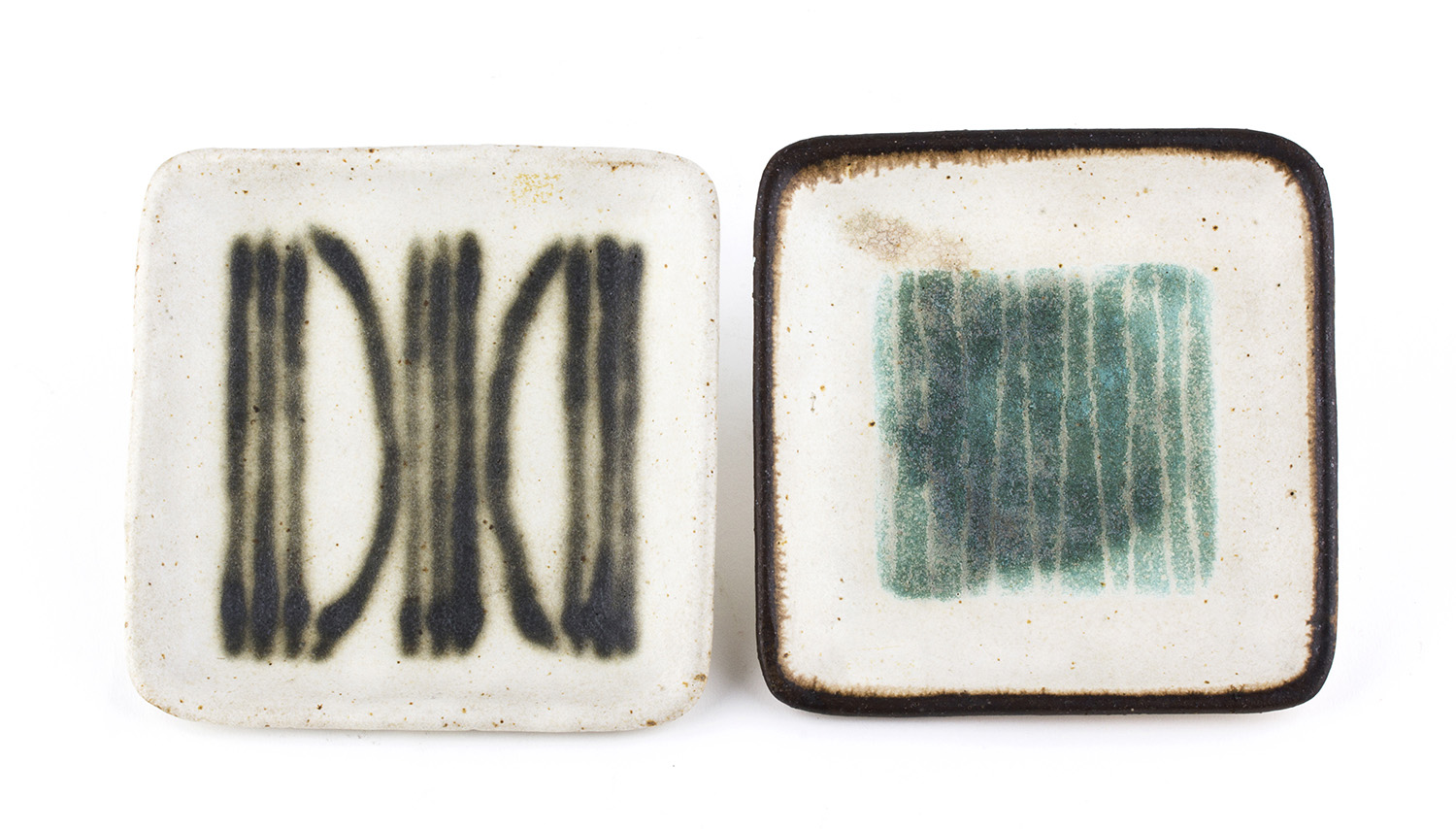 BRUNO GAMBONE Coppia di piccoli posacenere Terracotta dipinta a motivi astratti, l. 12,5 cm Firma e luogo sotto la base: Gambone Italy