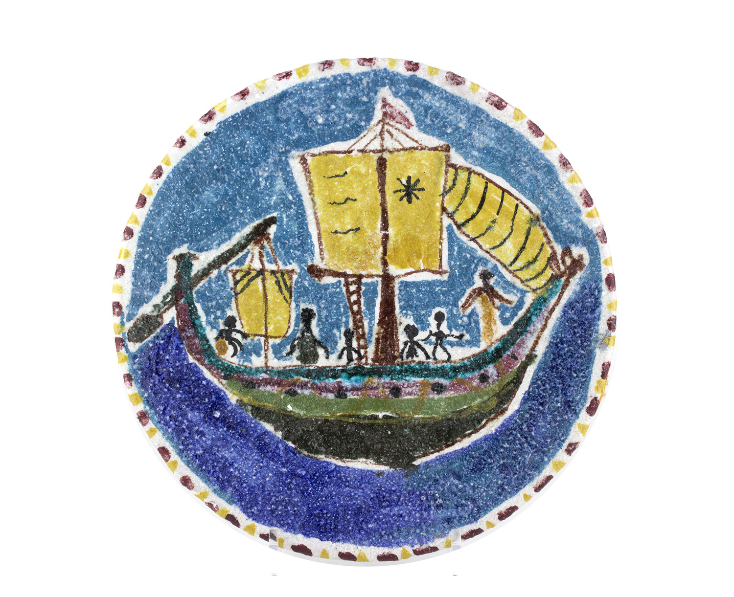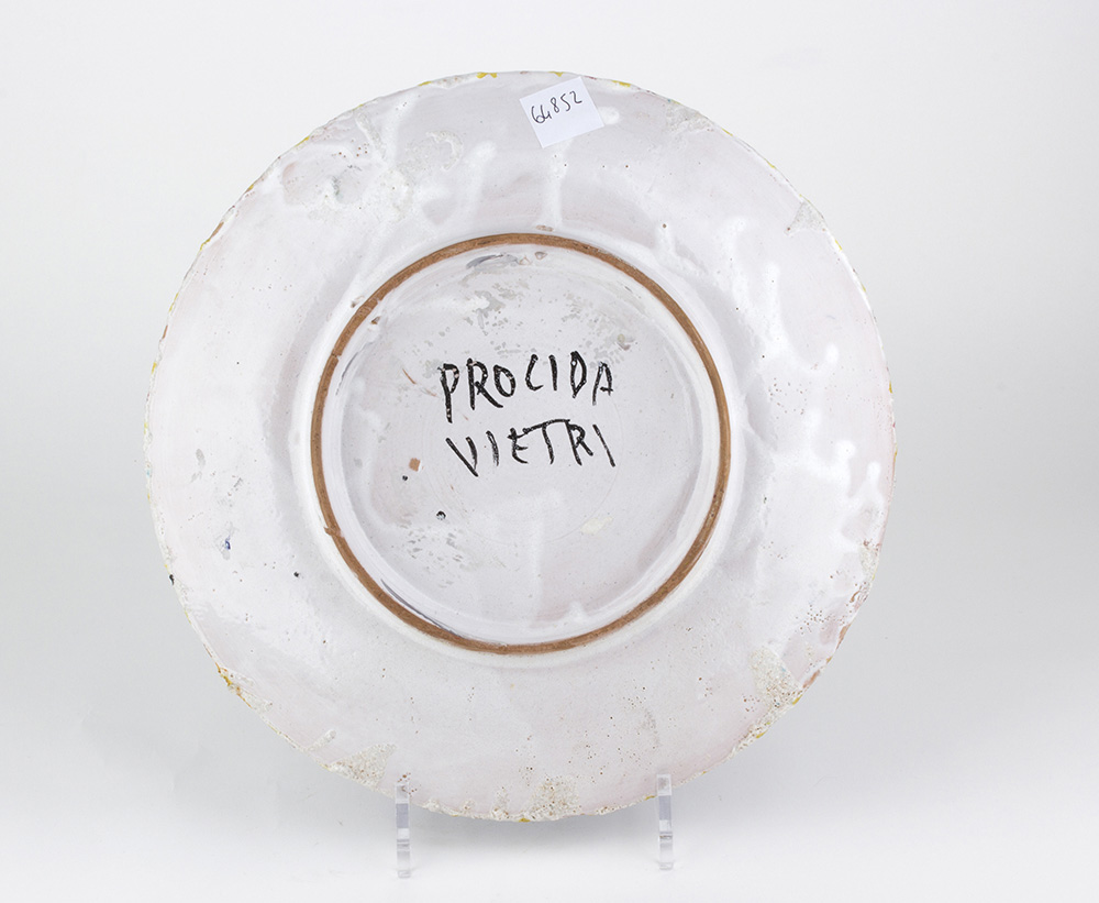 PROCIDA - VIETRI Piatto con veliero Maiolica dipinta, d. 28,5 cm Iscrizione sotto alla base: Procida Vietri