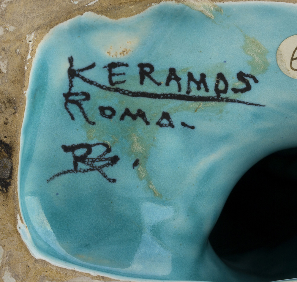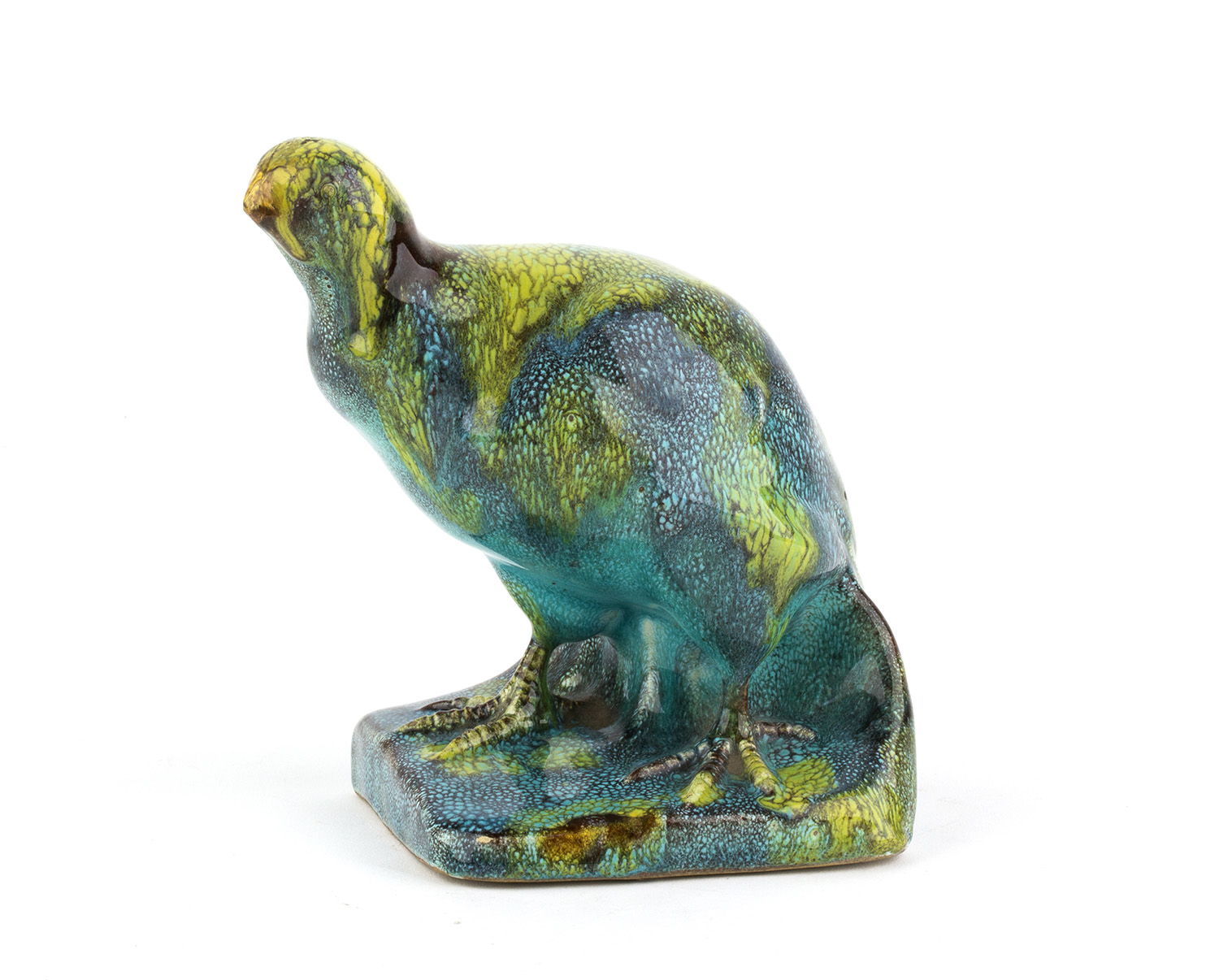 RENATO BASSANELLI - KERAMOS - ROMA Piccola quaglia, 1920 circa Scultura in terracotta dipinta a policromia e invetriata, h. 13 cm Firma e iniziali sotto la base: Keramos Roma RB