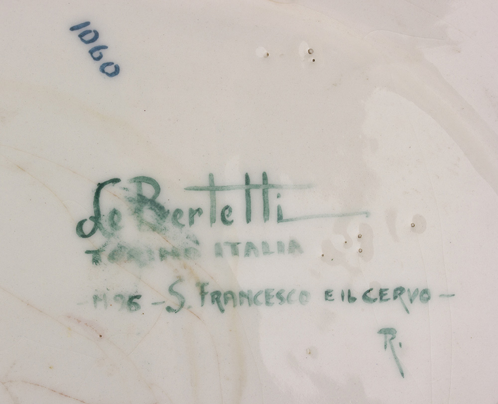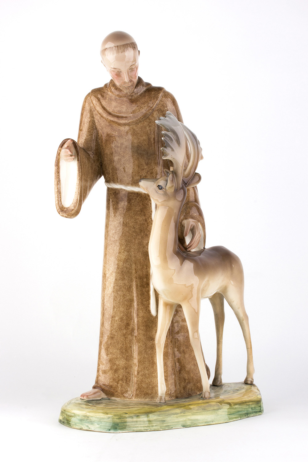 LE BERTETTI - TORINO San Francesco e il cervo, anni ‘30 Gruppo in ceramica formata a colaggio e dipinta in policromia, 54 x 33 x 18 cm Marchio, titolo e iniziale sotto la base: Le Bertetti Torino Italia, N. 96 San Francesco e il cervo, R.